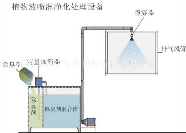 化学洗涤除臭技术亦称碱洗净化、溶解技术,是将恶臭气体通过洗涤塔添加与污染气体相溶反应的活性剂或碱液、植物提取液等洗涤反应而实现脱臭。通常,水洗只能去除可溶或部分微溶于水的恶臭物质,如氨等;酸洗可去除氨和胺类等碱性恶臭物质;碱洗则适于去除硫化氢、低级脂肪酸等酸性恶臭物质。因此,为了彻底去除废气中存在的各类不同的恶臭物质,可采用酸洗和碱洗相串联的多级化学洗涤和添加活性药剂、氧化剂、植物提取液等的方式脱臭,利用臭气成分与化学药液,植物提取液中的氧化性成份间发生不可逆的化学反应,生成新的无臭物质以达到脱臭的目的。