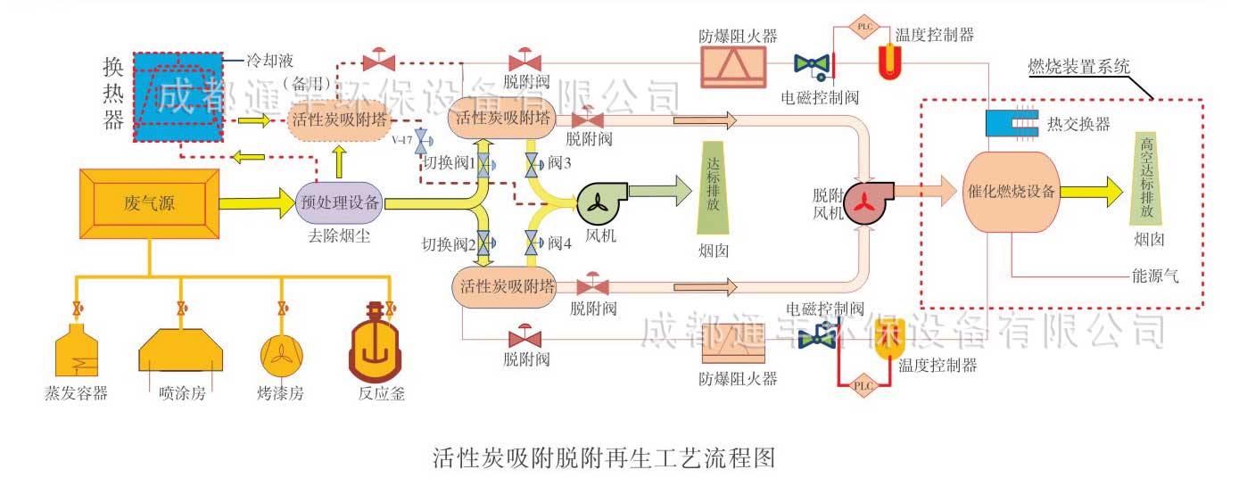 催化燃烧装置(RCO):首先,通过除尘灭火系统。然后进入热交换器,送入加热室,使气体达到燃烧反应温度。然后,通过催化床的作用,有机废气可以在较低的温度下分解成二氧化碳和水。最后,它进入热交换器与低温气体进行热交换,从而进入气体的温度可以上升到反应温度。如果未达到反应温度,加热系统可以通过自动控制系统实现补偿加热。